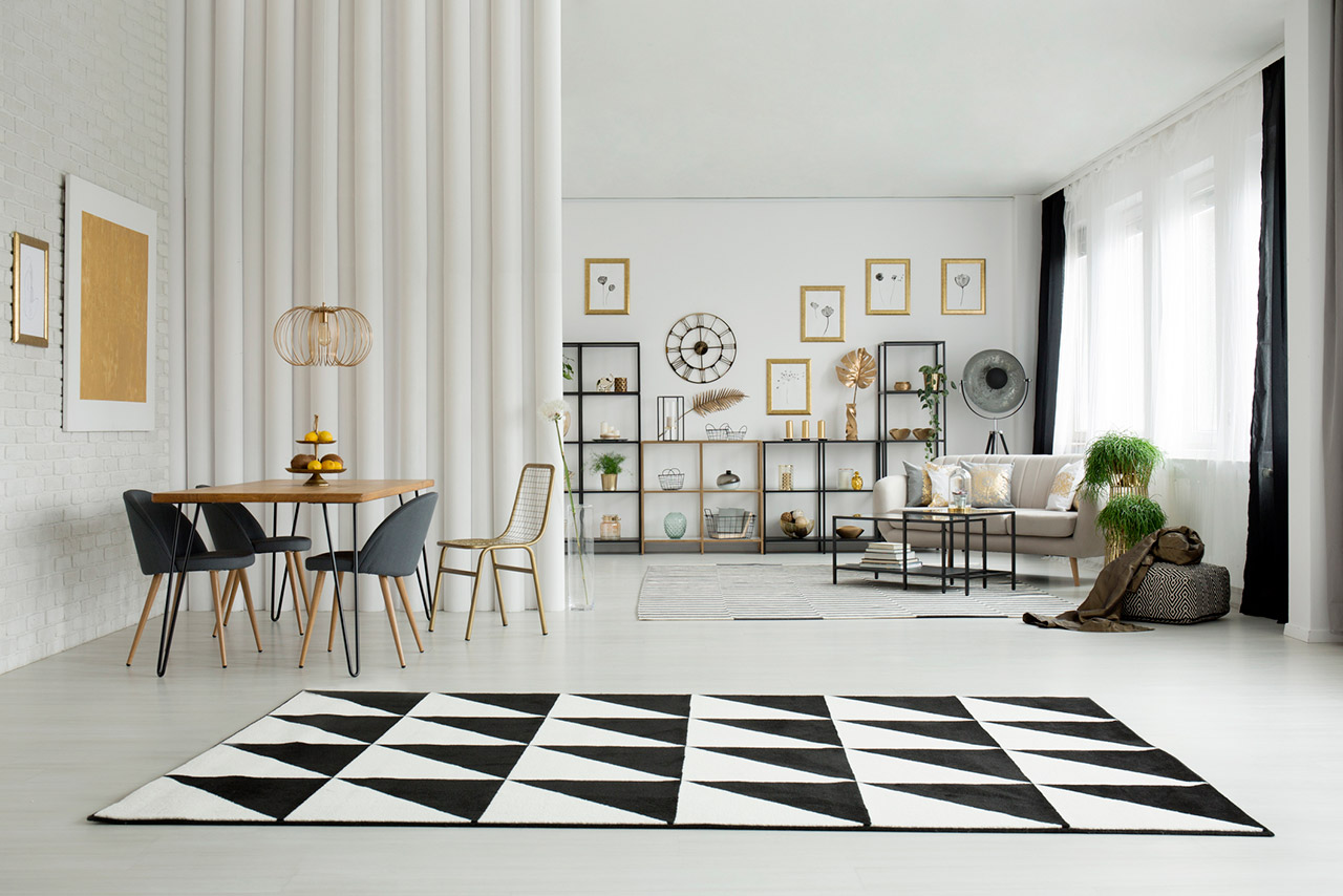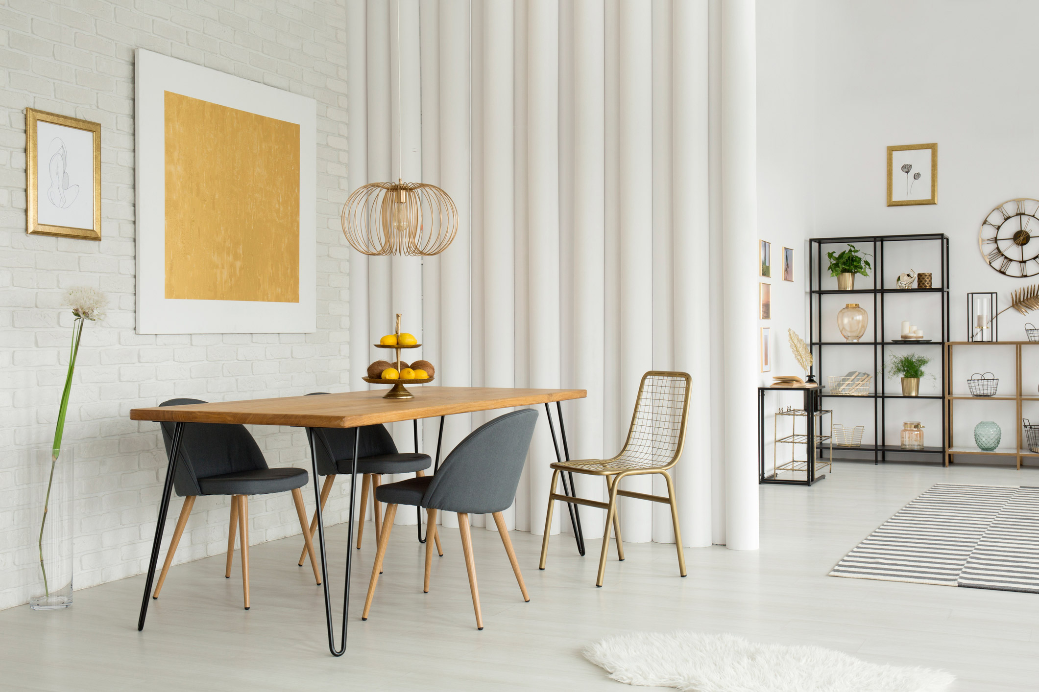 Your gallery wall doesn’t have to end where the wall hits the flooring. Considering tying in other aspects of the room by coordinating colors and materials on pieces such as rugs, furniture, lamps, plants, bedding, decorative pillows, and more. Or, if you’ve already styled the rest of the room, use those colors to inspire the pieces in your gallery wall.